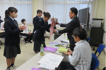 囲碁部での3年間の功績で表彰を受ける信田さん(左)